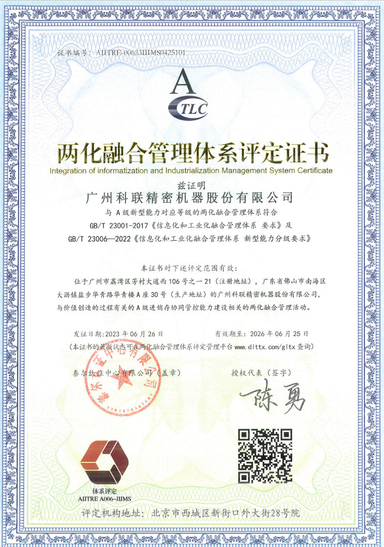A级新型能力的实力印证 根据泰尔认证中心有限公司于2023年6月26日颁发的两化融合管理体系评定证书(编号:AITRE A006-IIMS),广州科联精密机器股份有限公司的两化融合管理体系完全符合GB/T 23001-2017《信息化和工业化融合管理体系要求》及GB/T 23006-2022《信息化和工业化融合管理体系新型能力分级要求》,并在“A级进销存协同管控能力建设”领域达到标准化要求。